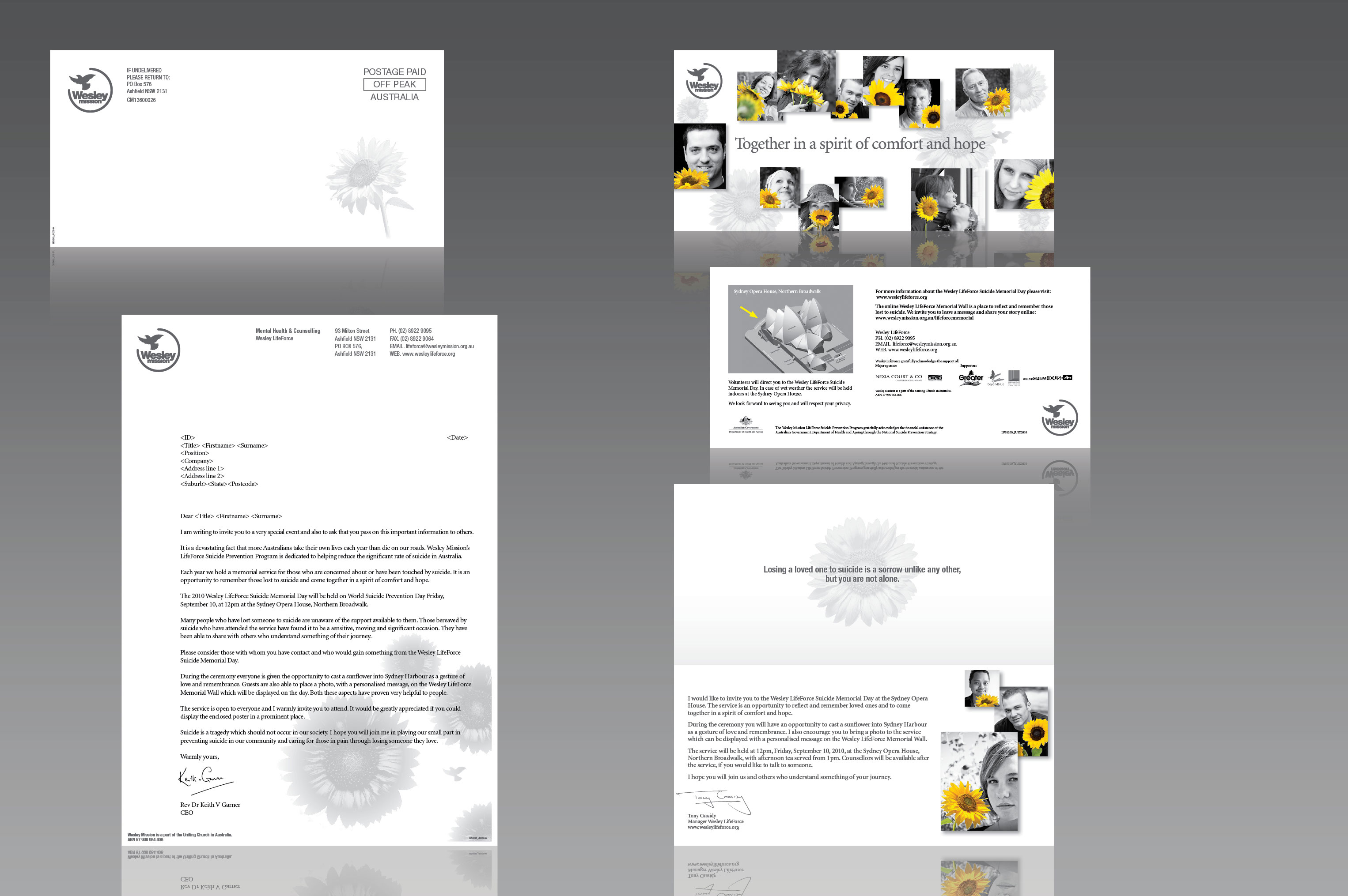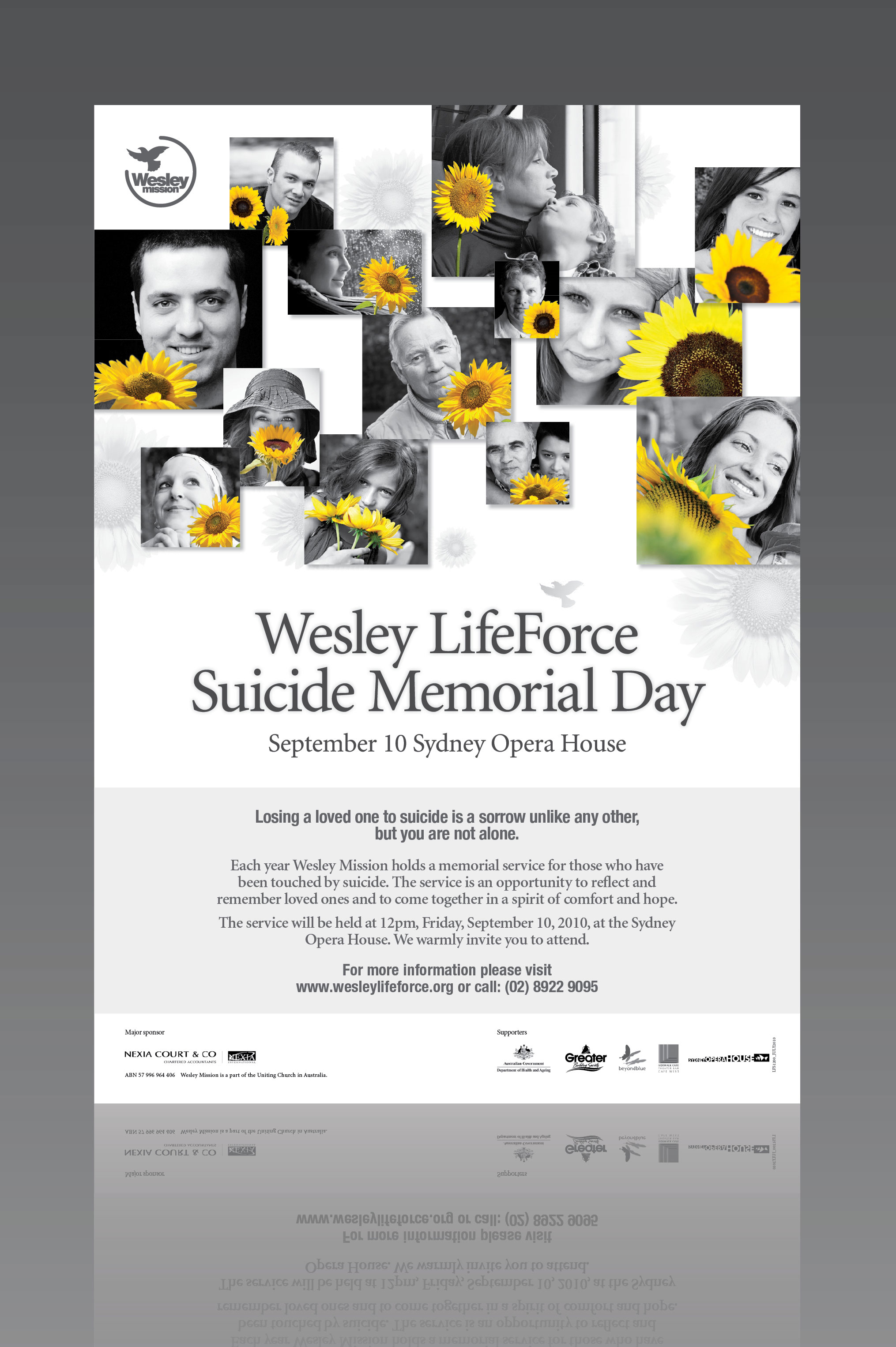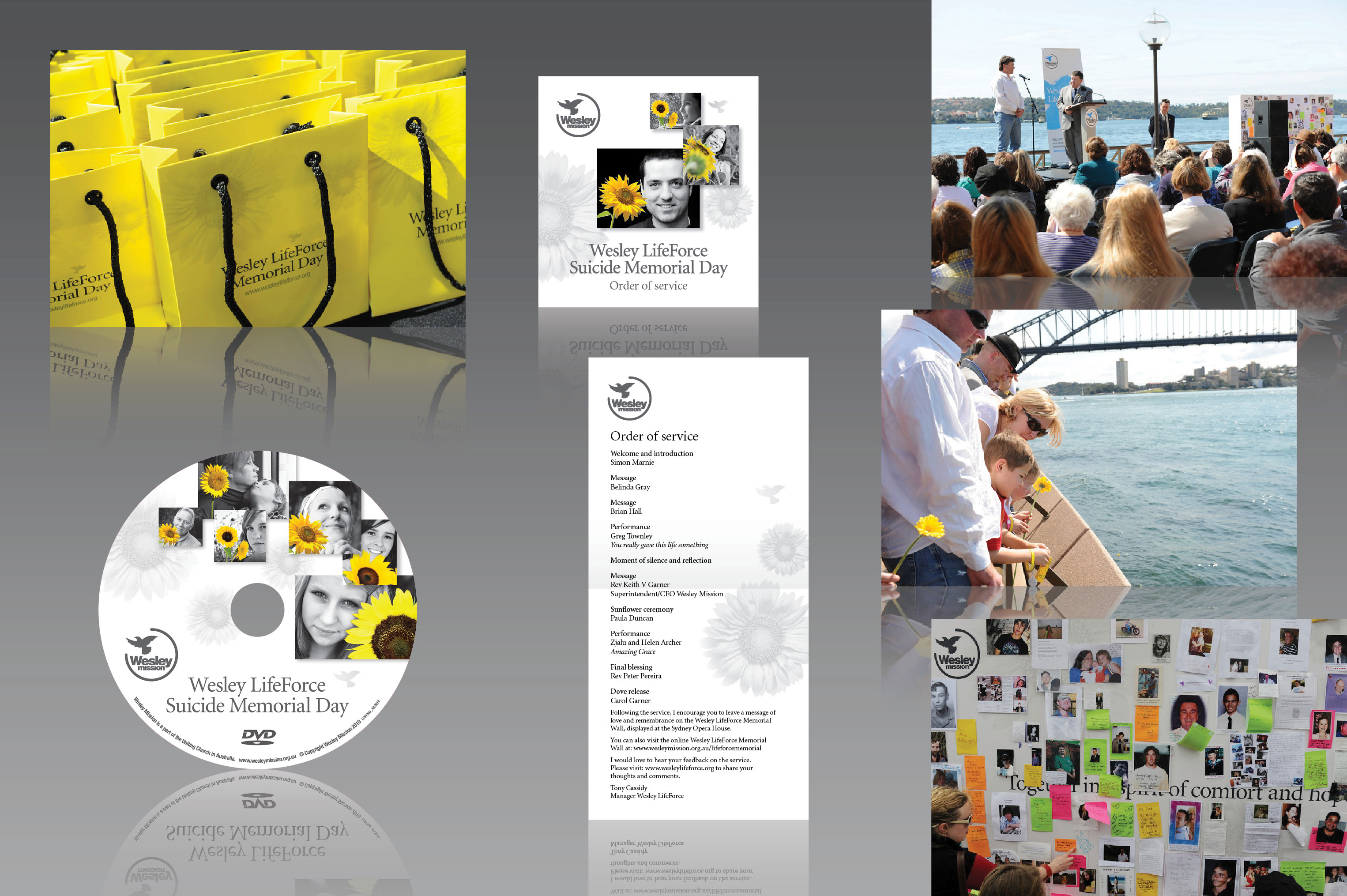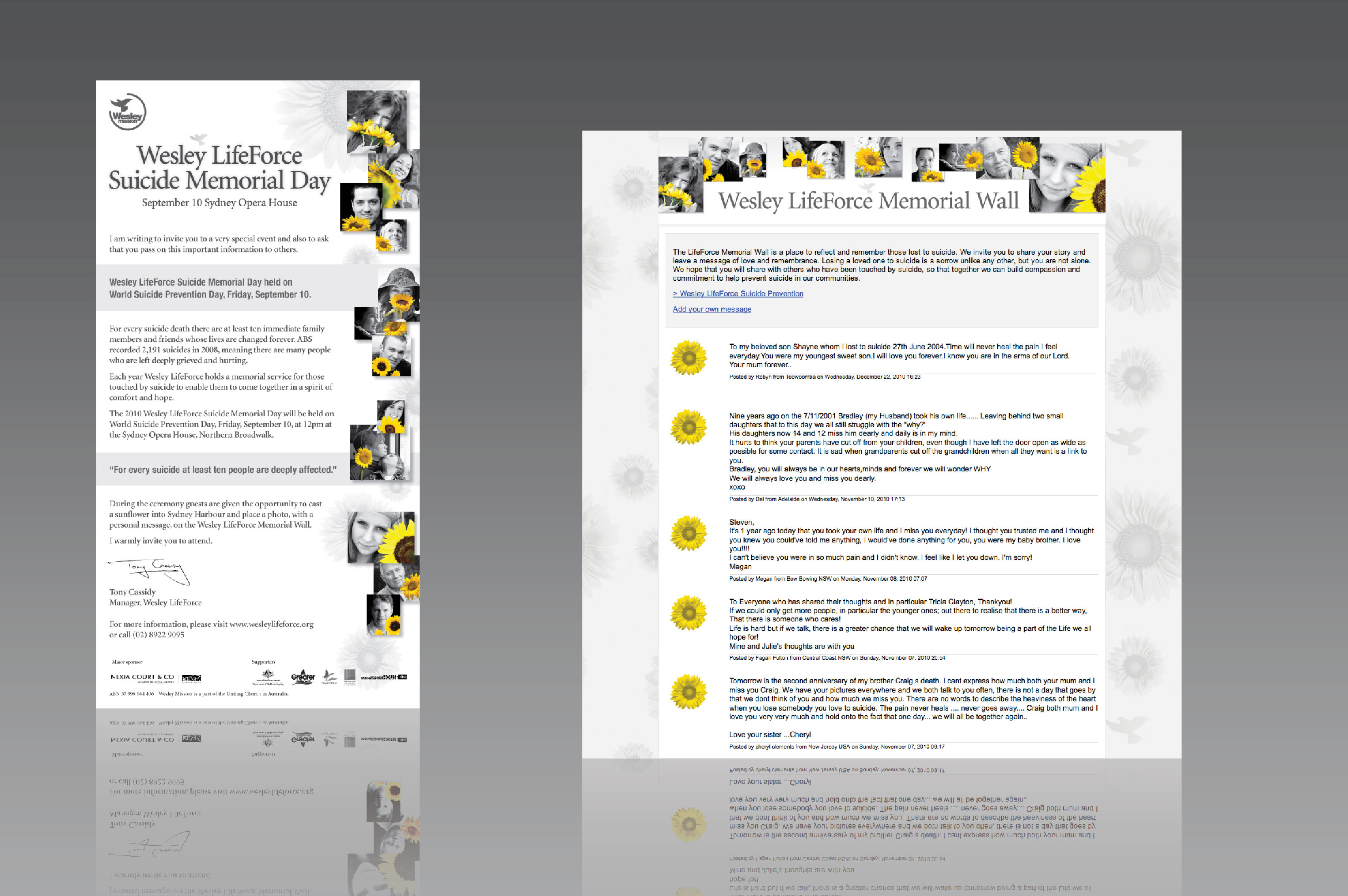 Each year Wesley LifeForce holds a memorial service for those bereaved by suicide to enable them to come together in a spirit of comfort and hope. During the ceremony guests are given the opportunity to place a photo, with a personal message, on the Wesley LifeForce Memorial Wall. Role: concept, design, artwork.