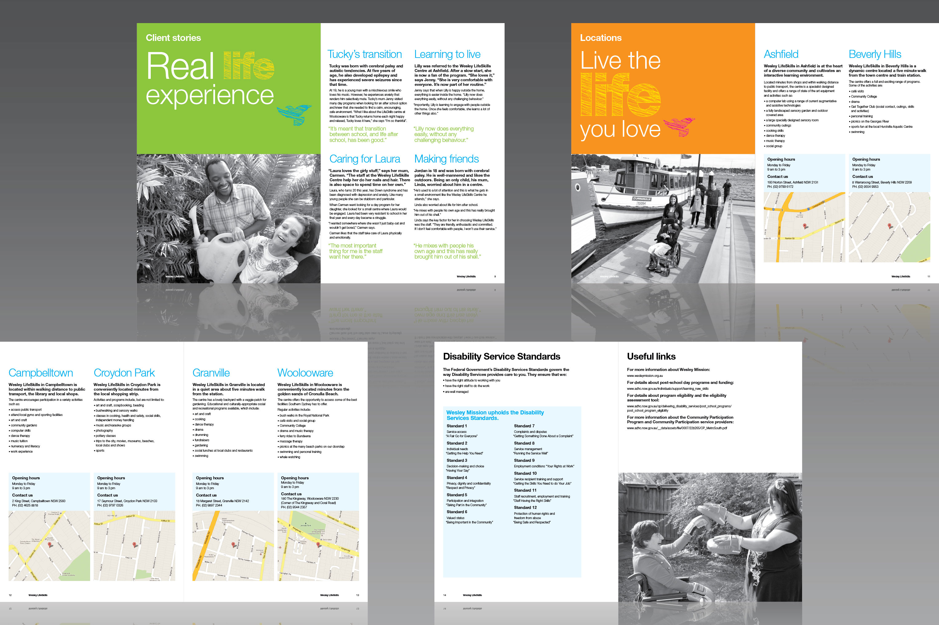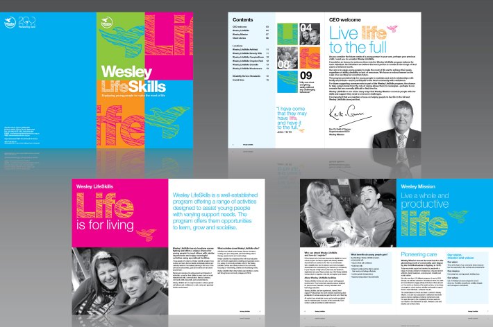 Wesley LifeSkills connects young people people with the skills and support they need to overcome challenges, live life to the full and to achieve their goals regardless of ability, disability or lack of resources. The program enables them to maintain and enrich relationships with family and friends—and to participate in the local community with confidence. Role: concept, design, artwork.