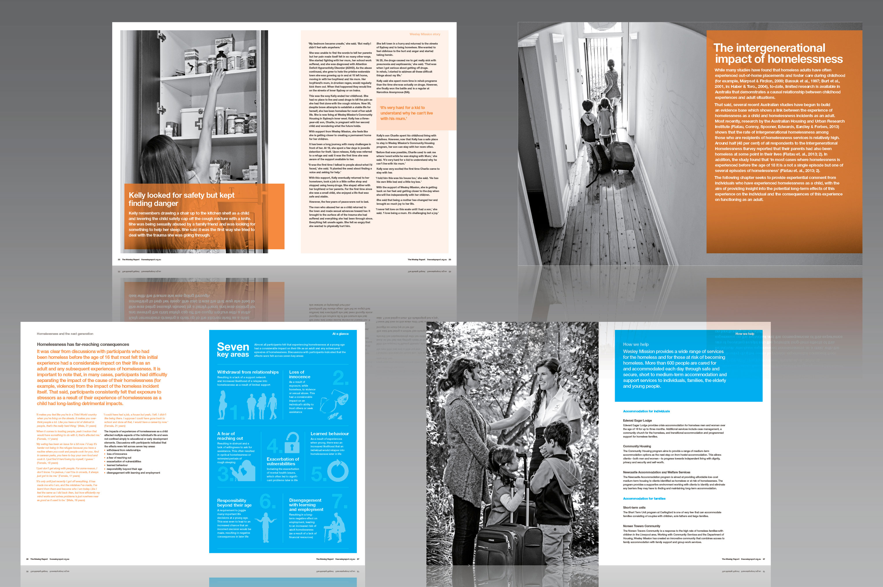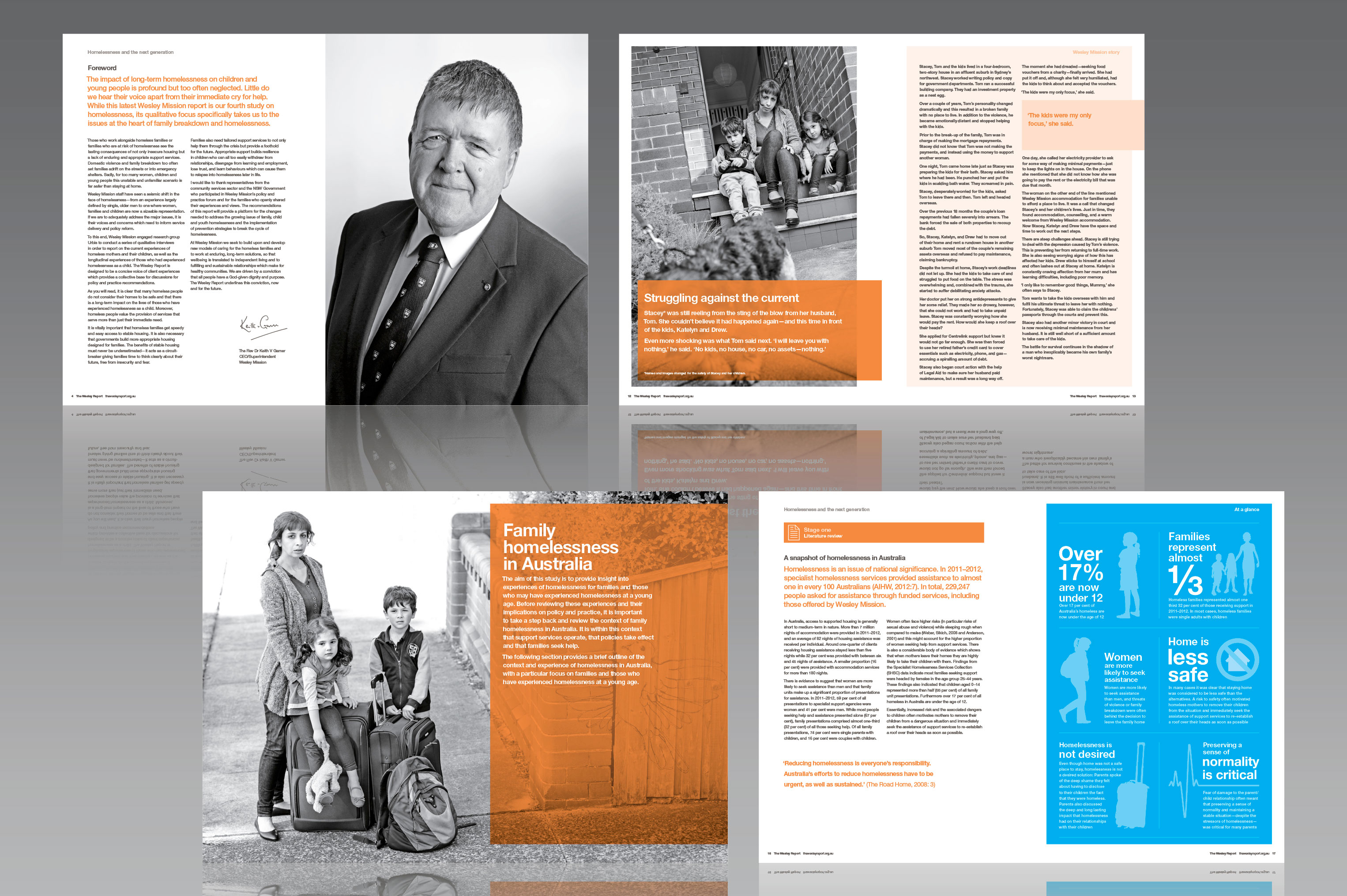 For some, homelessness is safer than home. It is difficult to imagine a life where the home is a dangerous place yet 34 per cent of those seeking help for homelessness do so as a result of abuse (Australian Institute of Health and Welfare, 2012). The 2013 Wesley Report; Homelessness and the next generation looks at the immediate and long-term issues facing homeless mothers, their children and those who experienced homelessness as a child. Role: concept, design, artwork.