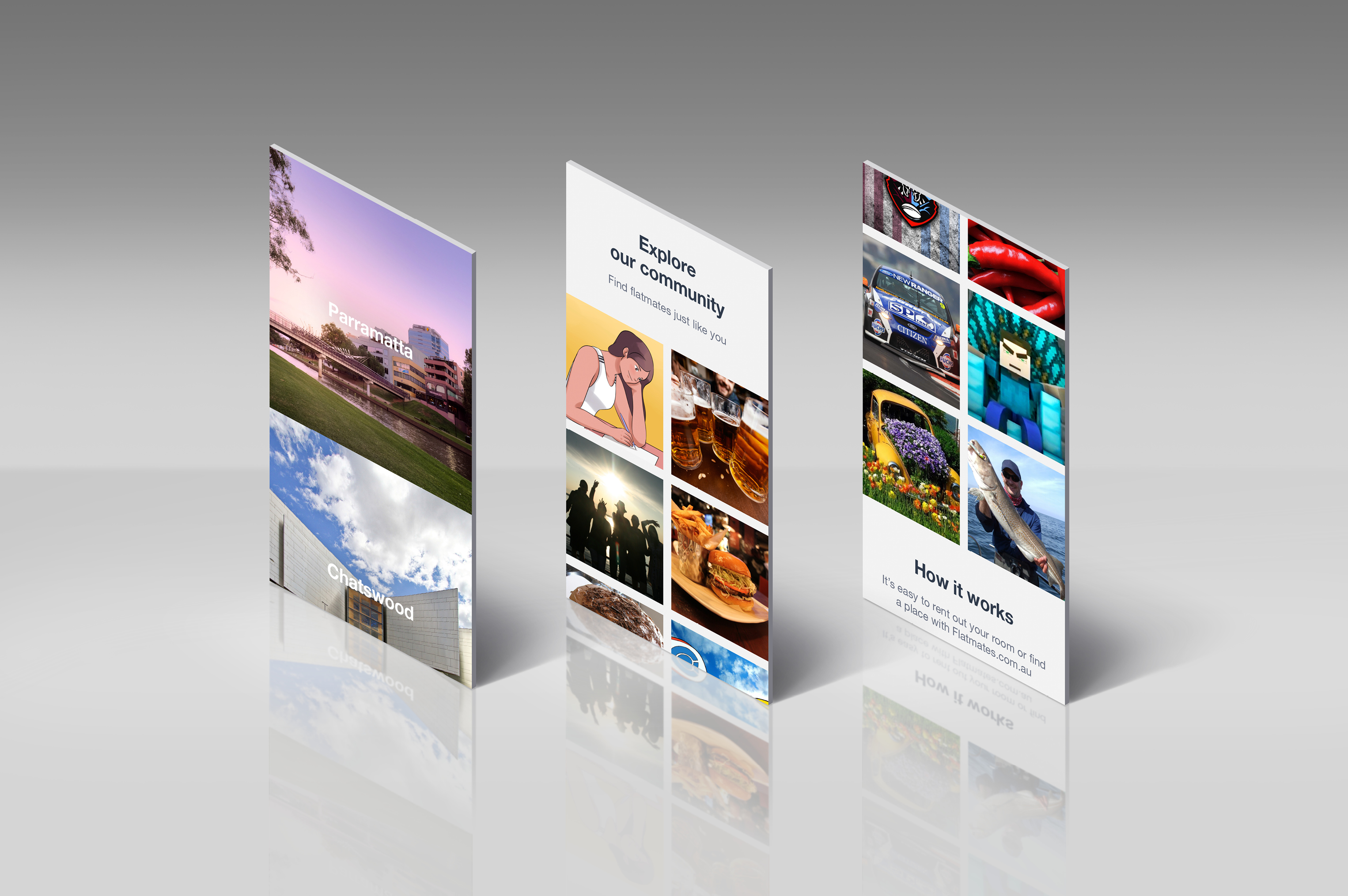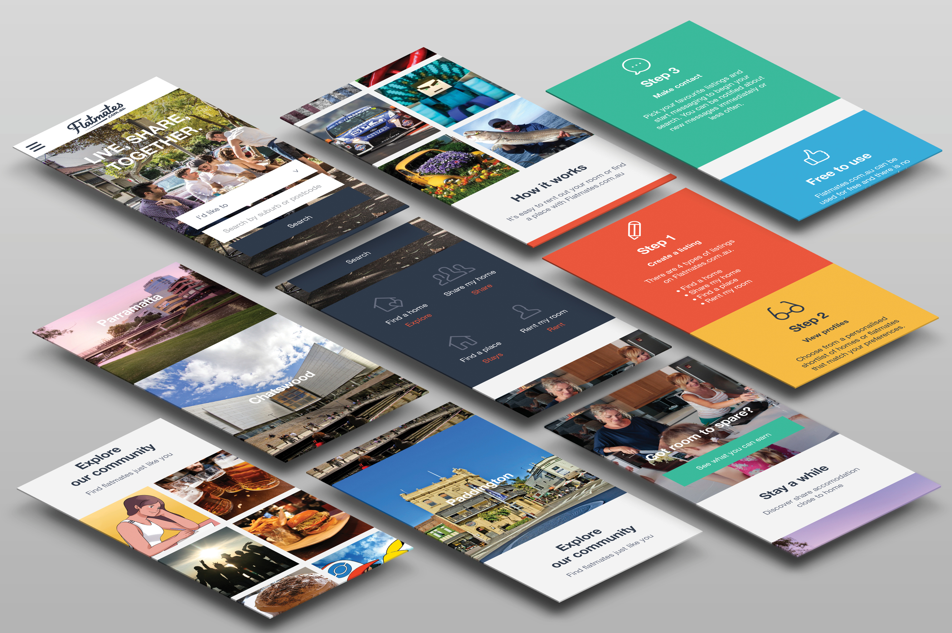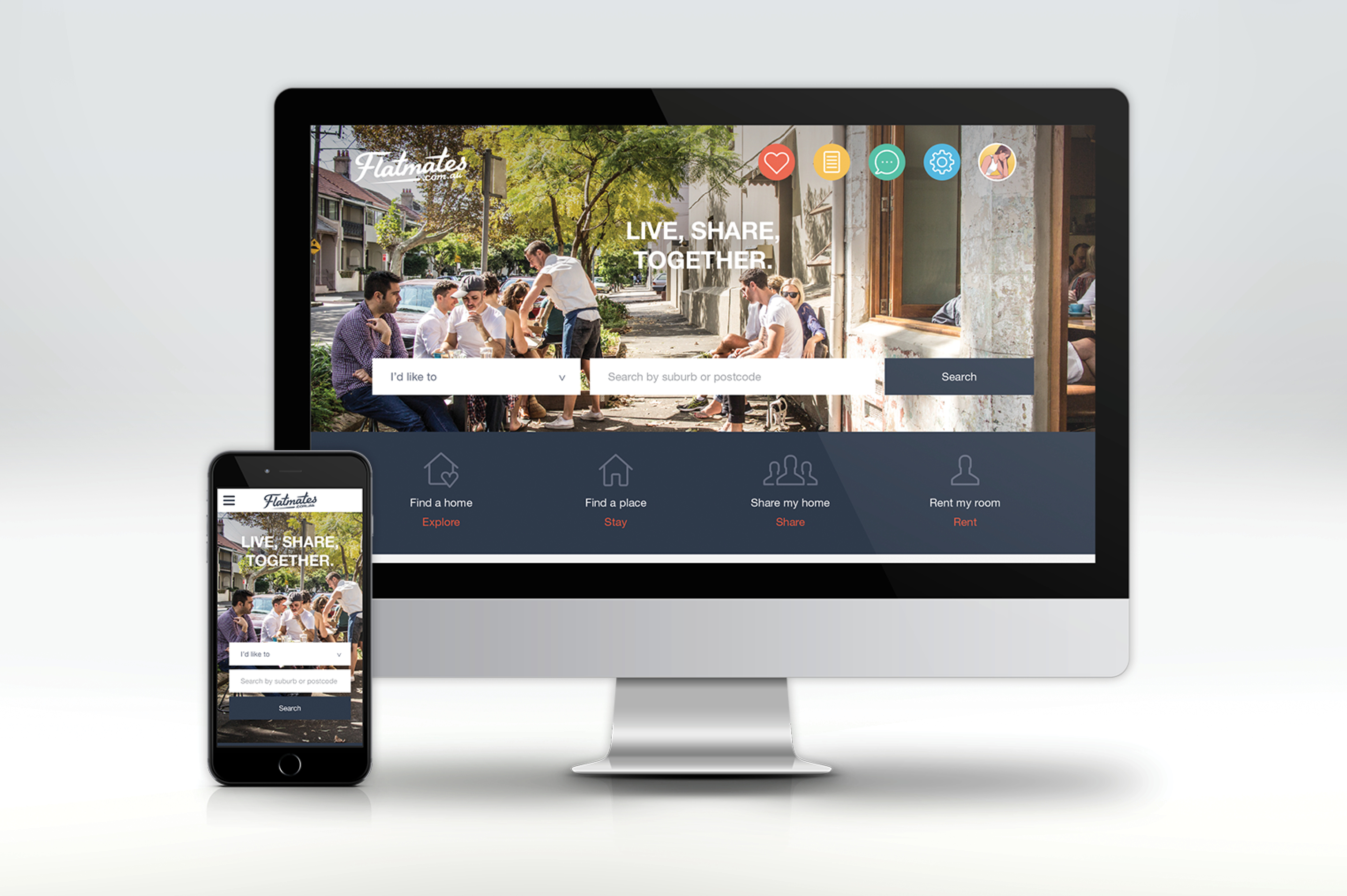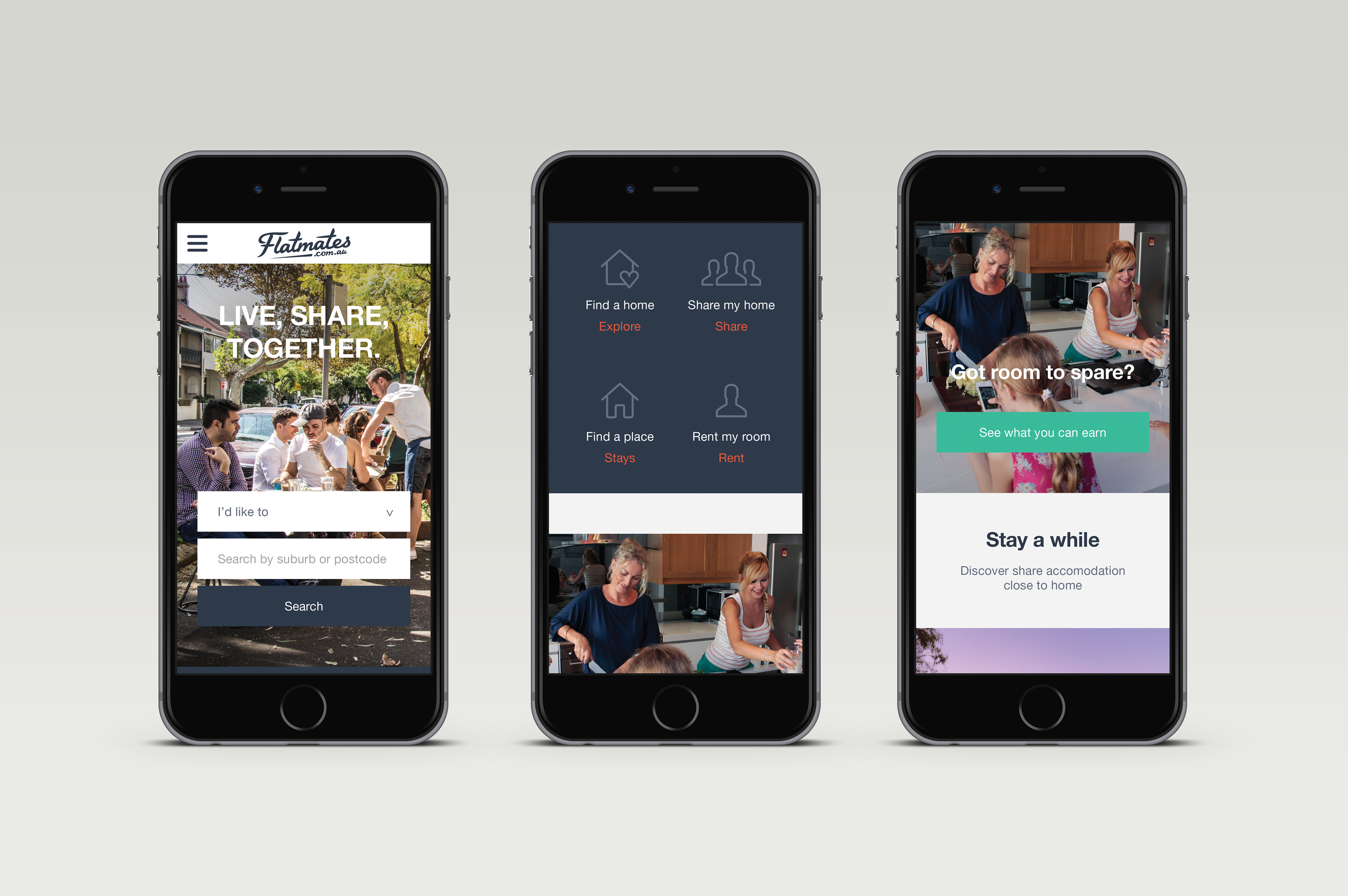 flatmates.com.au wants to revolutionise share accomodation, shifting from a directory style search approach to a more emotive and engaging discovery experience. Make a search prompt an emotive proposition and give flatmates.com.au a playful personality that sets it apart from the competition. Your proposed solution should explore a range of aesthetic approaches and create a unique experience within the category. Role: concept, design, artwork.