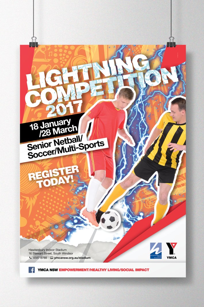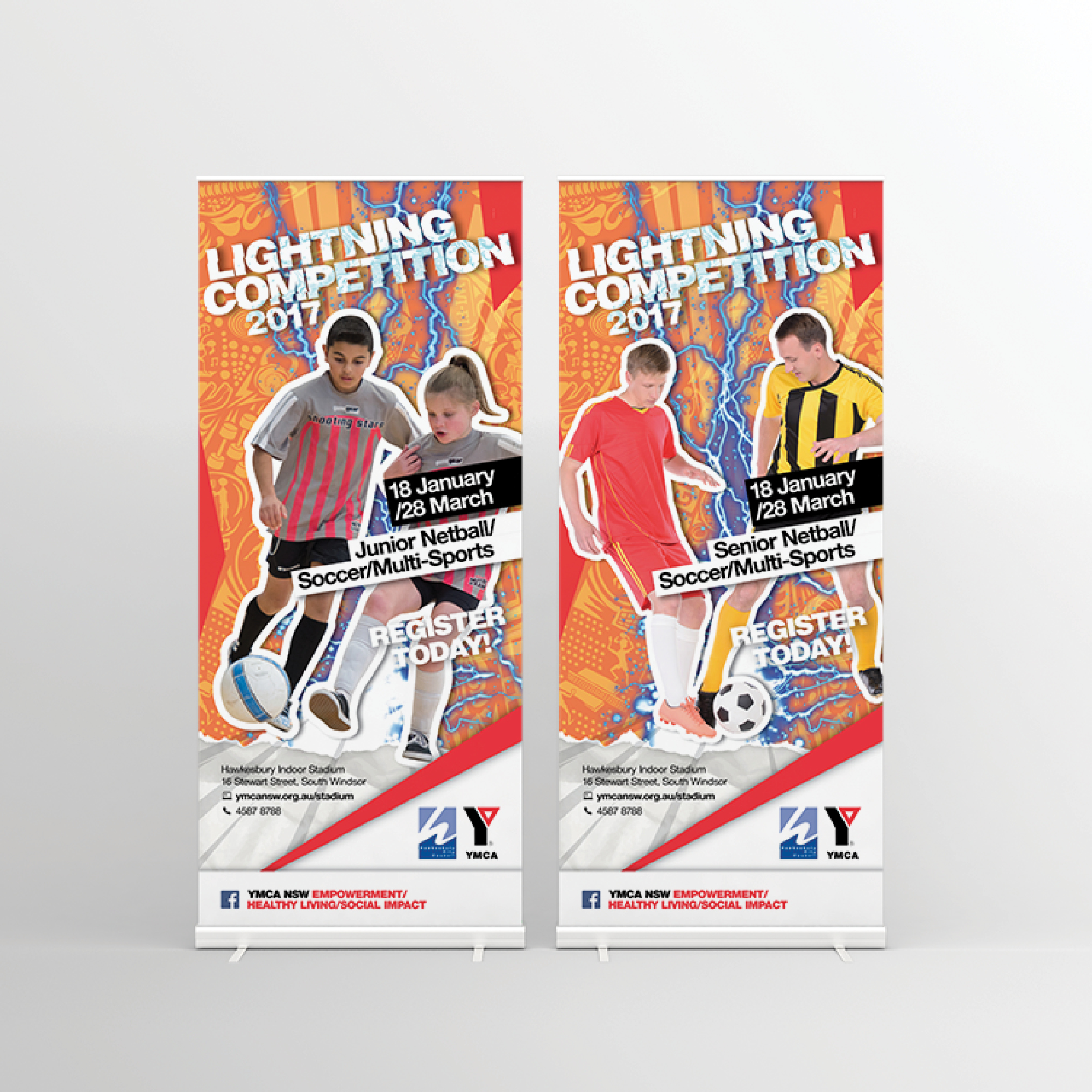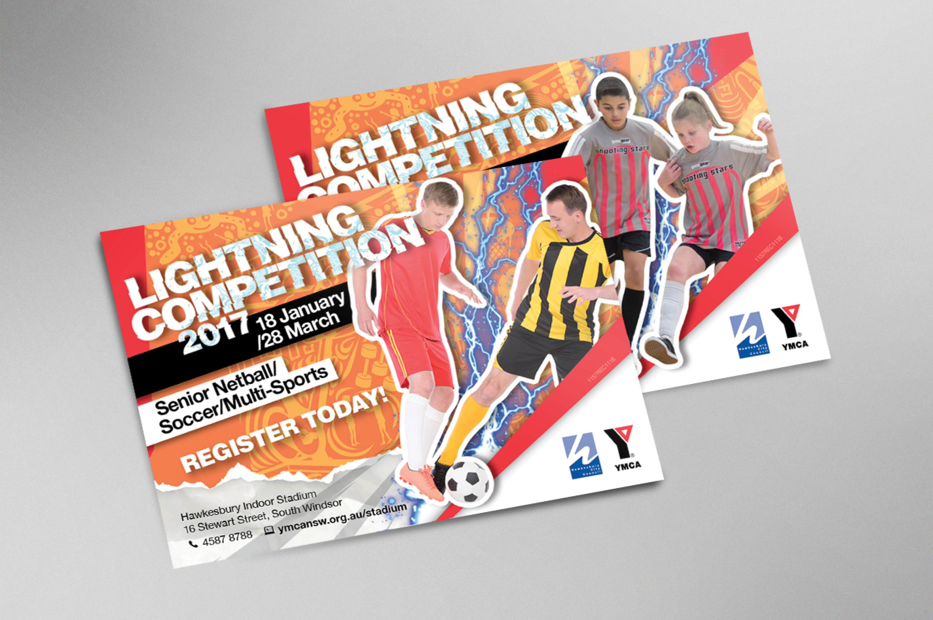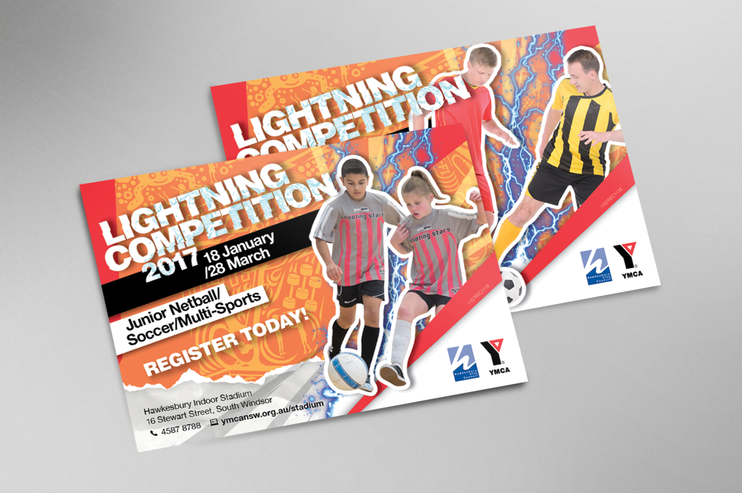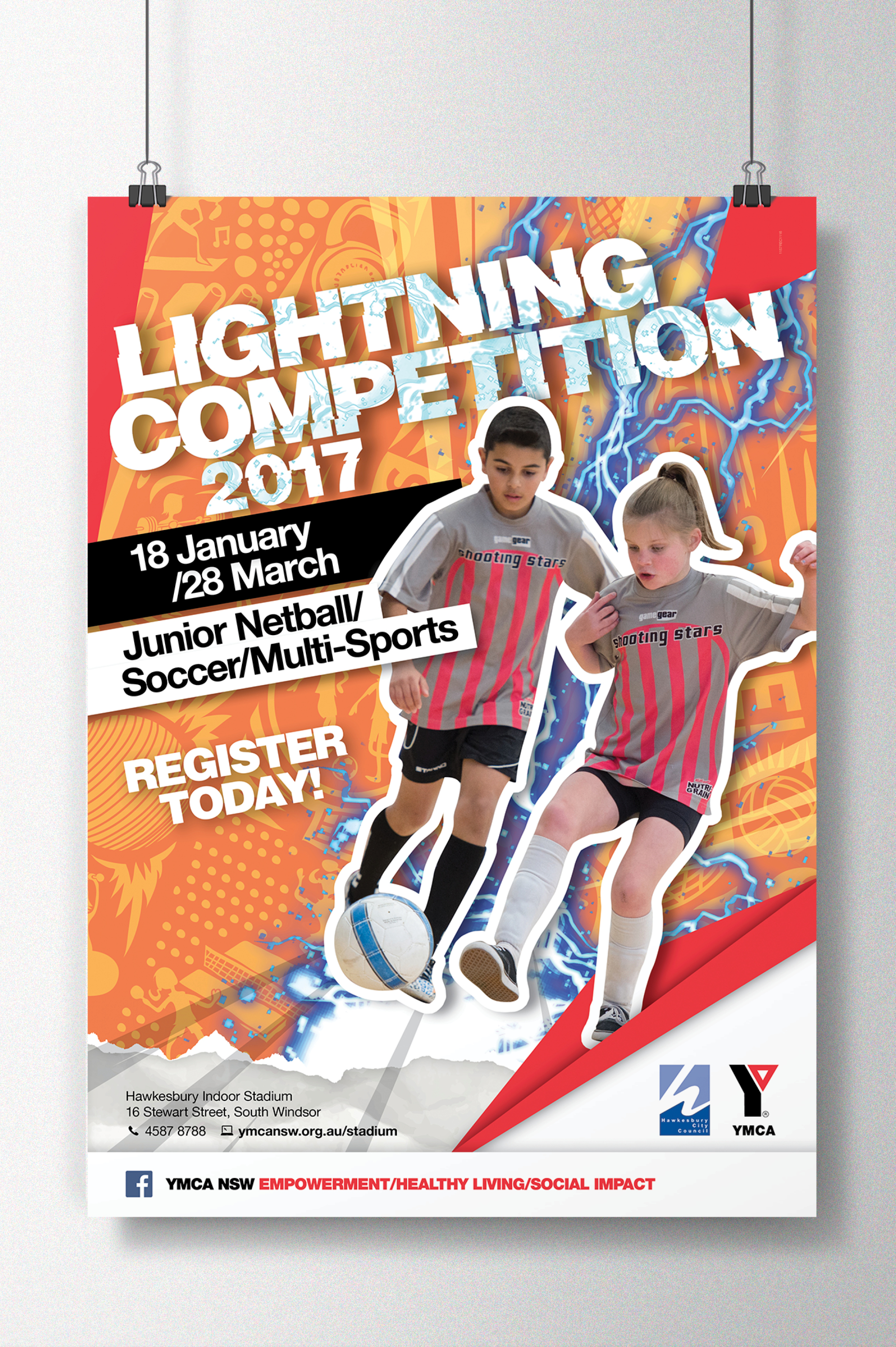 Revitalise/revamp existing look and feel for YMCA Lightning Sports Competition. YMCA indoor sports competitions are professionally run and seriously fun, offering the latest in online draws, results and fixtures. Lightning Competitions provide the perfect opportunity to keep fit and healthy in a safe, social environment. Role: concept, design, artwork.