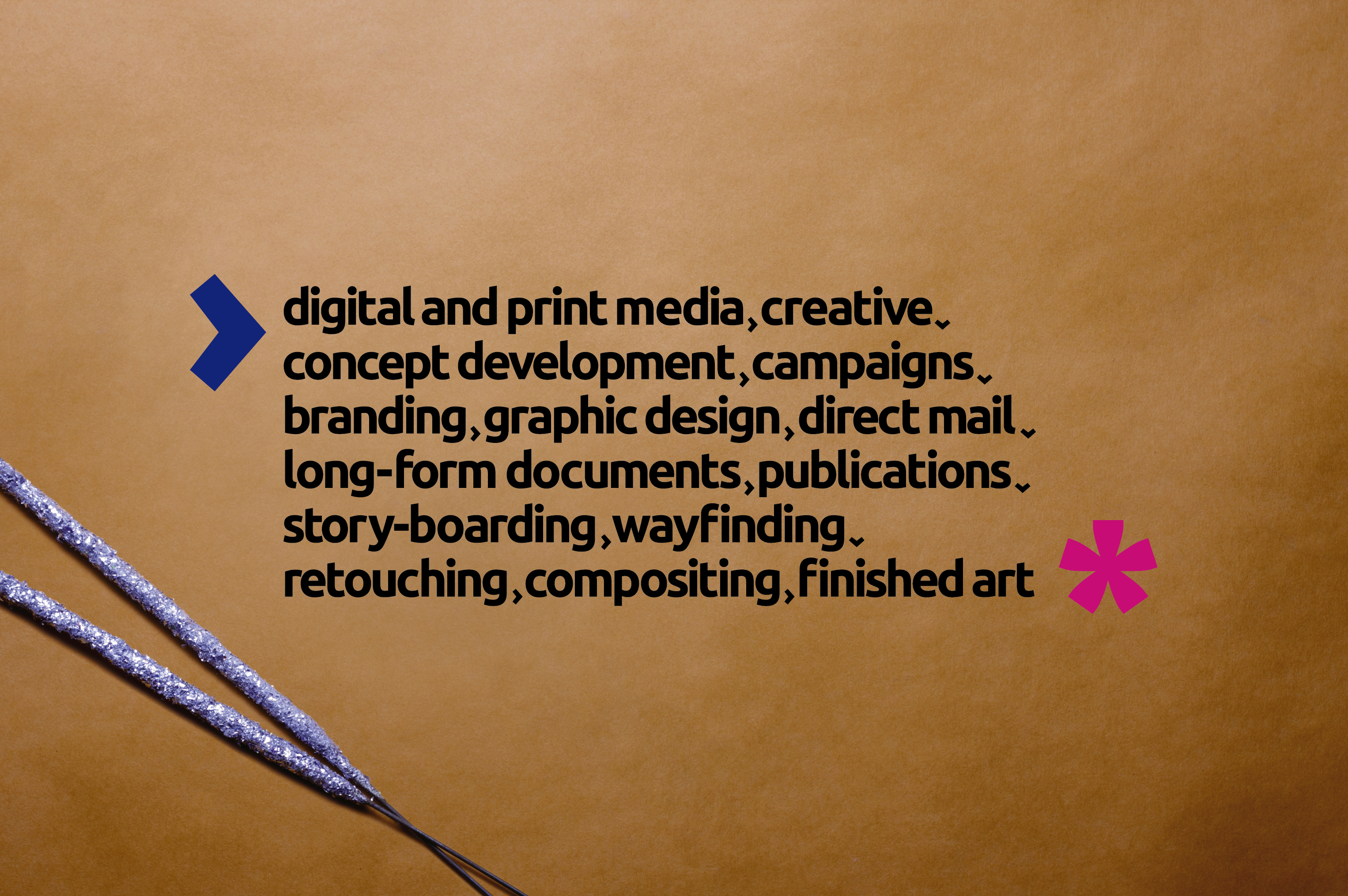 Digital and print media, creative, concept development, campaigns, branding, graphic design, long-form documents, publications, direct mail, story-boarding, wayfinding, retouching, compositing, finished art.